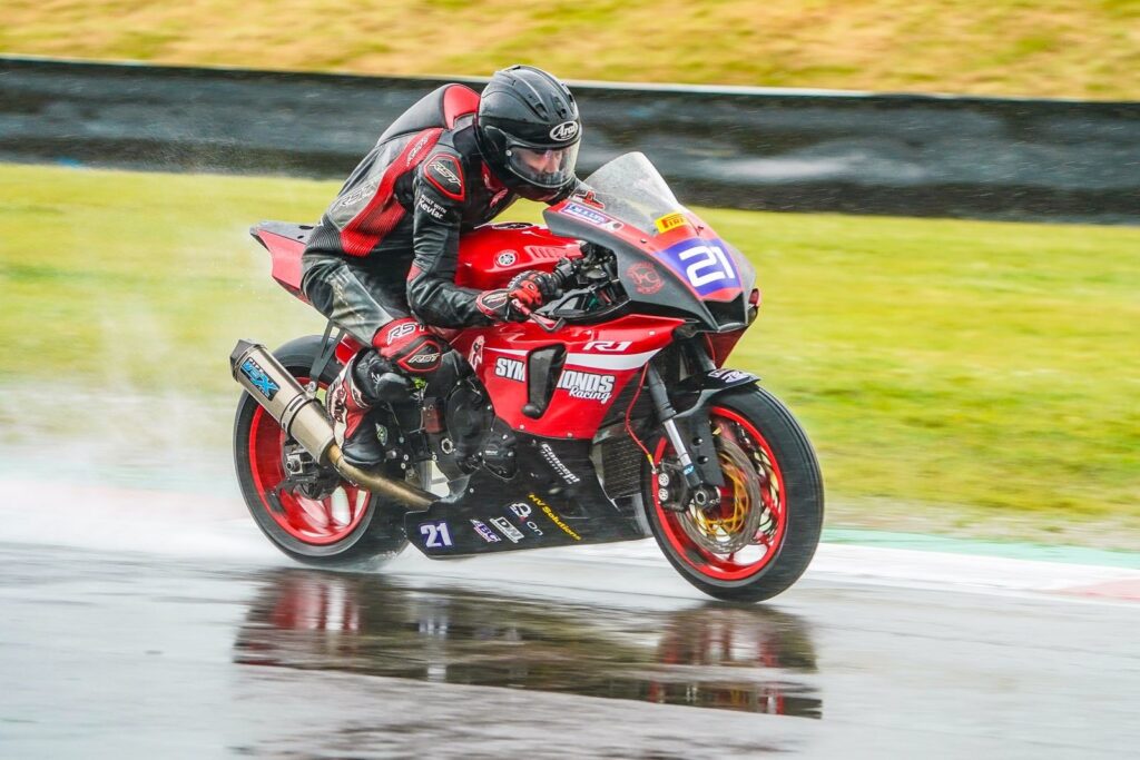 “The weather played a big part in Max’s third round of National Superstock in 2024. Following clear skies and sun on Friday where Max bettered his personal best at the circuit by 0.8 of a second, the heavens opened on Saturday for qualifying with several rounds of heavy rain flooding the circuit and caused the on-track action to be halted. In-between this when bikes were on track crashes happened every lap – over the day a total of 96 riders hit the deck which was a new record for most crashes in a single day of BSB! Max kept it upright throughout this to qualify 24th.