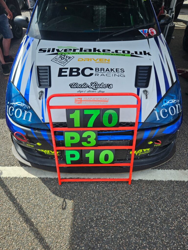 “Following on from promising pace at Castle Combe, I headed to Donington Park with three races to do in one day and a lot of high hopes! After a reasonable Qualifying, the car made sure I got knocked down to earth in Race 1 with a bump: a two-race-old genuine ford Turbo solenoid hose failed, putting me to the back of a 40-car grid once again!